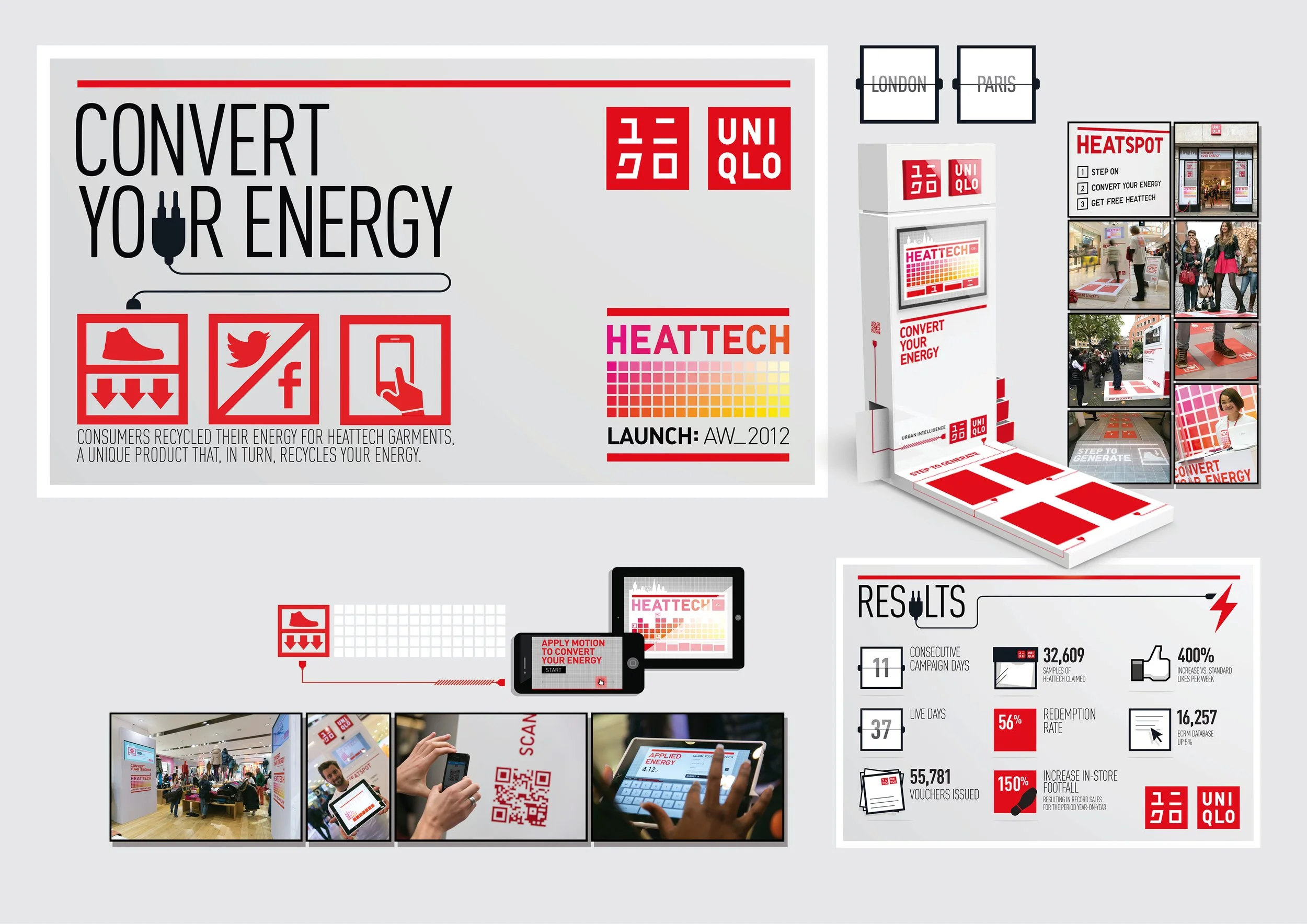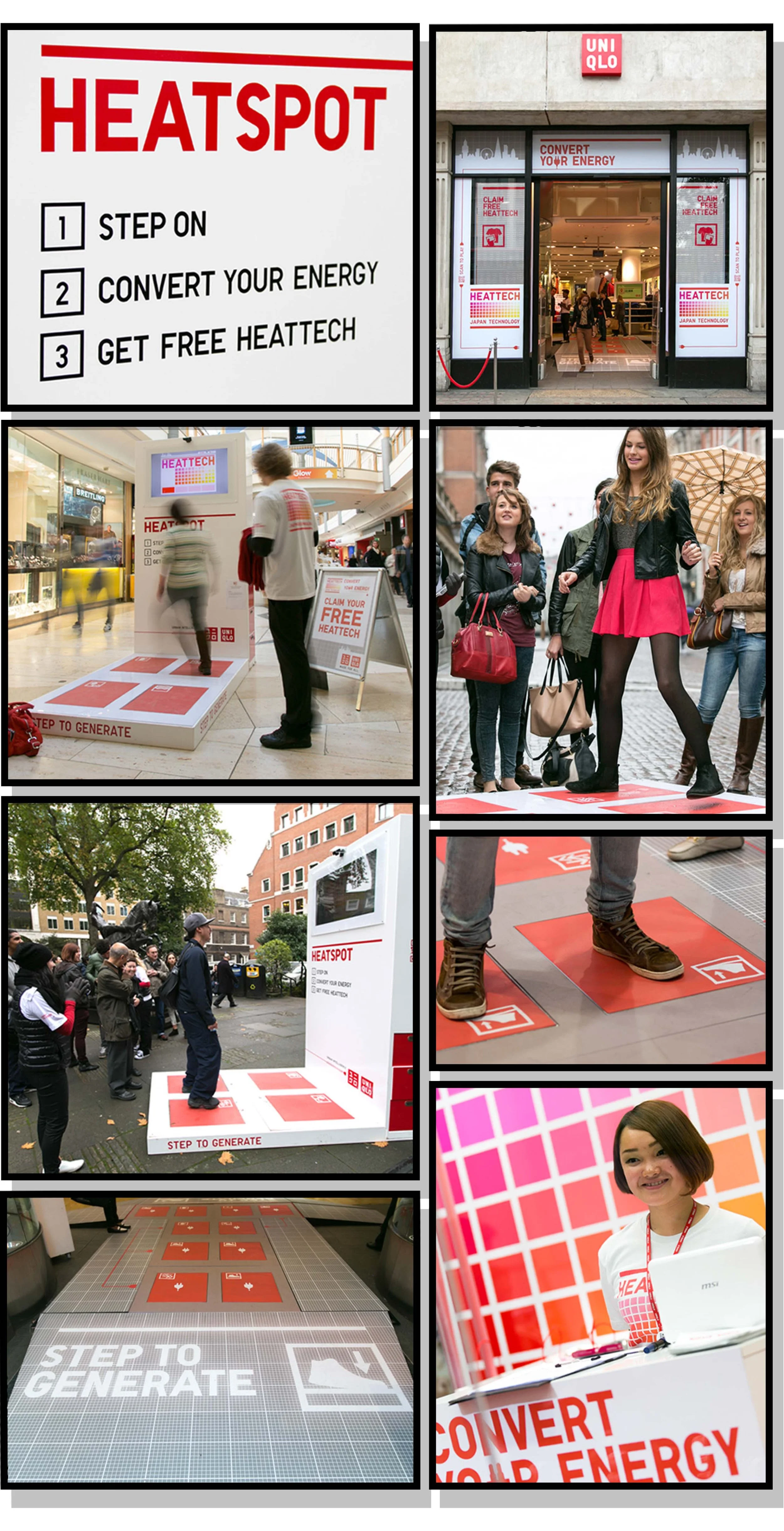HeatTech is a unique product that recycles your energy. Using several different types of technology, consumers were encouraged to recycle their own energy in exchange for HeatTech products. They used their footsteps to create energy on 'Pavegen' pressure pads in store and in high footfall areas, participated in a multi-platform game and created social 'heat' from simply talking abut the brilliantly unique product.